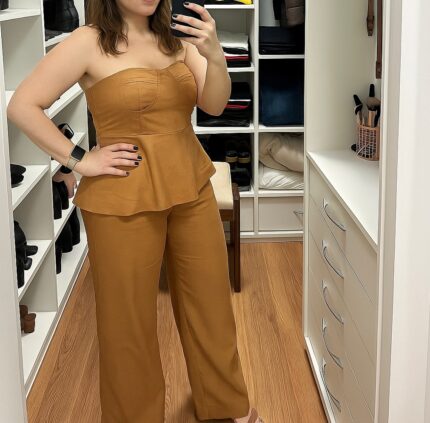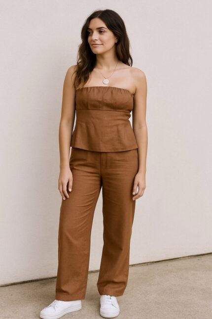 Conjunto elegante em linho, composto por calça de corte reto e blusa tomara que caia com zíper nas costas. Um look moderno e sofisticado, ideal para diversas ocasiões — do trabalho ao jantar especial.