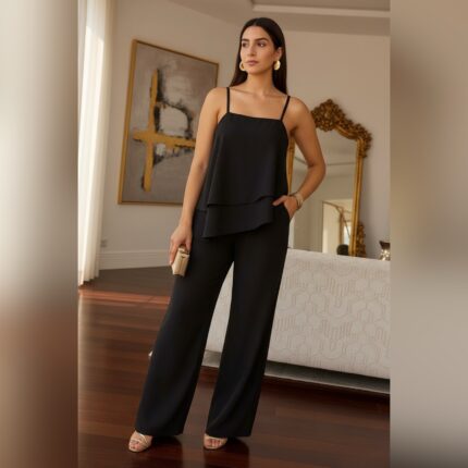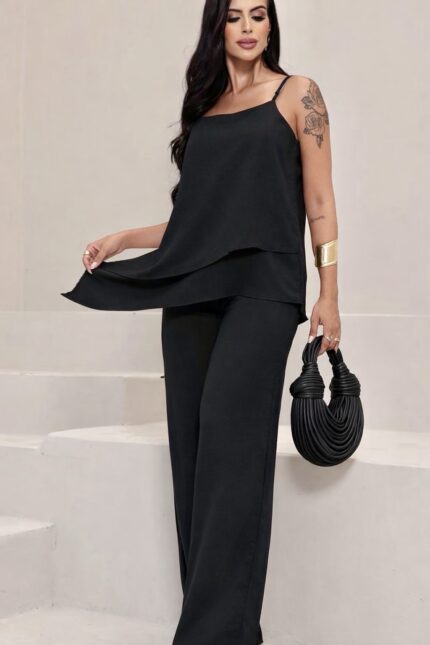 A blusa tem modelagem soltinha com alças finas e sobreposição delicada, enquanto a calça pantalona garante um visual alongado e