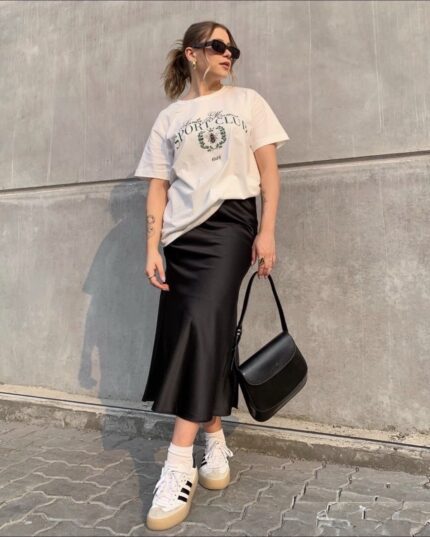 Saia mídi de cetim na cor preta, com acabamento acetinado e caimento fluido que garante elegância e sofisticação. Modelo atemporal e versátil, ideal para compor produções do dia à noite, valorizando a silhueta com conforto e leveza.