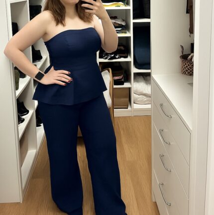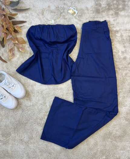 Conjunto elegante em linho, composto por calça de corte reto e blusa tomara que caia com zíper nas costas. Um look moderno e sofisticado, ideal para diversas ocasiões — do trabalho ao jantar especial.