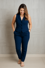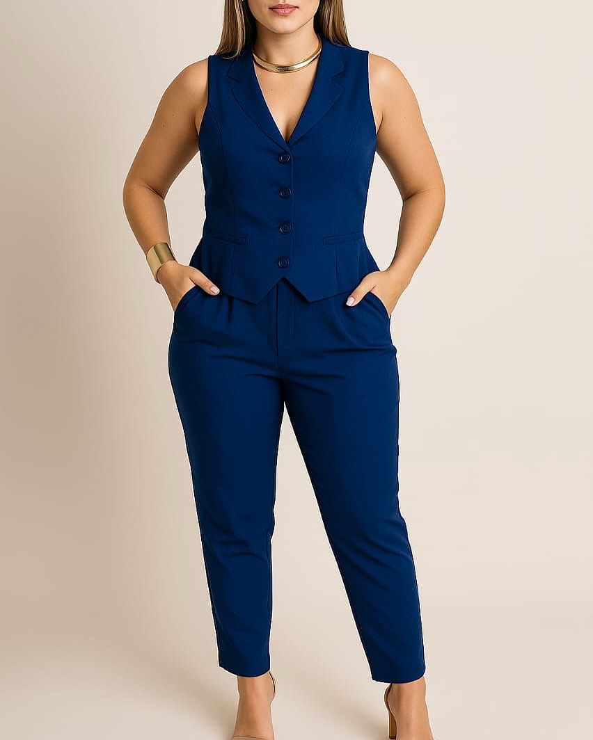 Conjunto em alfaiataria 100% poliéster, composto por colete estruturado com abotoamento frontal e calça de cintura alta com caimento reto. Um look elegante, moderno e versátil — perfeito para produções sofisticadas no dia a dia ou no ambiente de trabalho. Aposte nessa combinação atemporal para elevar o seu estilo!