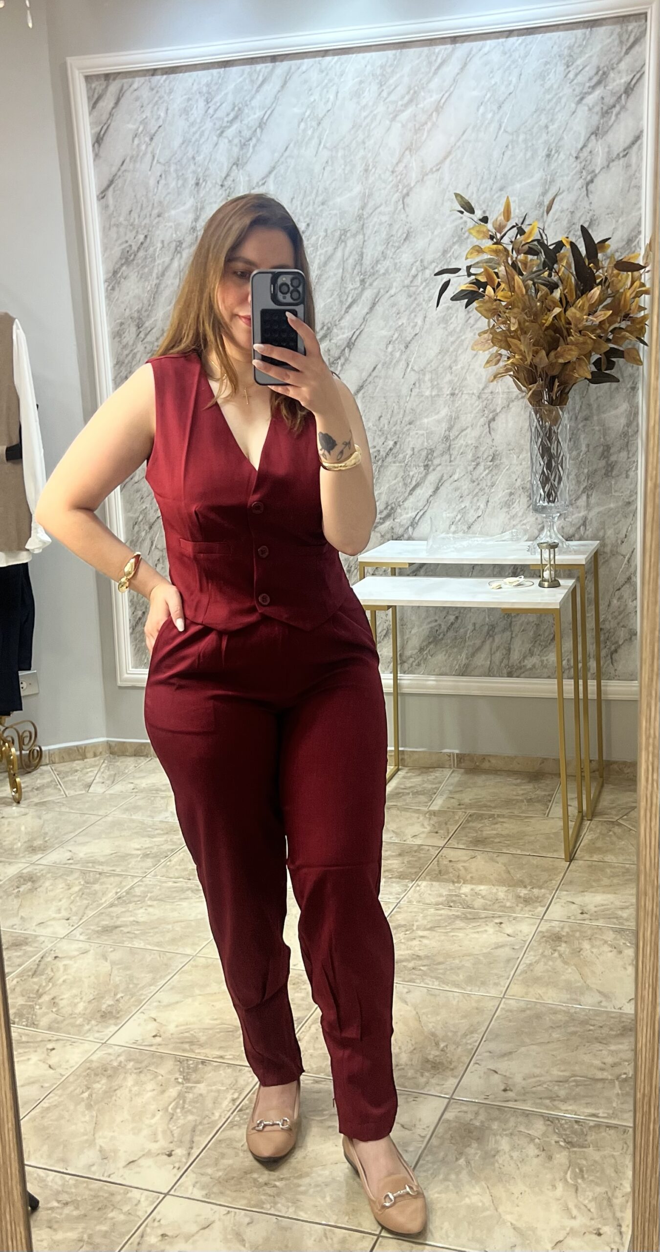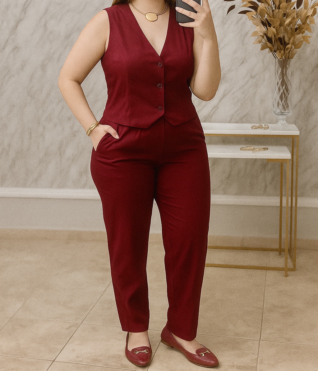 Conjunto em alfaiataria 100% poliéster, composto por colete estruturado com abotoamento frontal e calça de cintura alta com caimento reto. Um look elegante, moderno e versátil — perfeito para produções sofisticadas no dia a dia ou no ambiente de trabalho. Aposte nessa combinação atemporal para elevar o seu estilo!