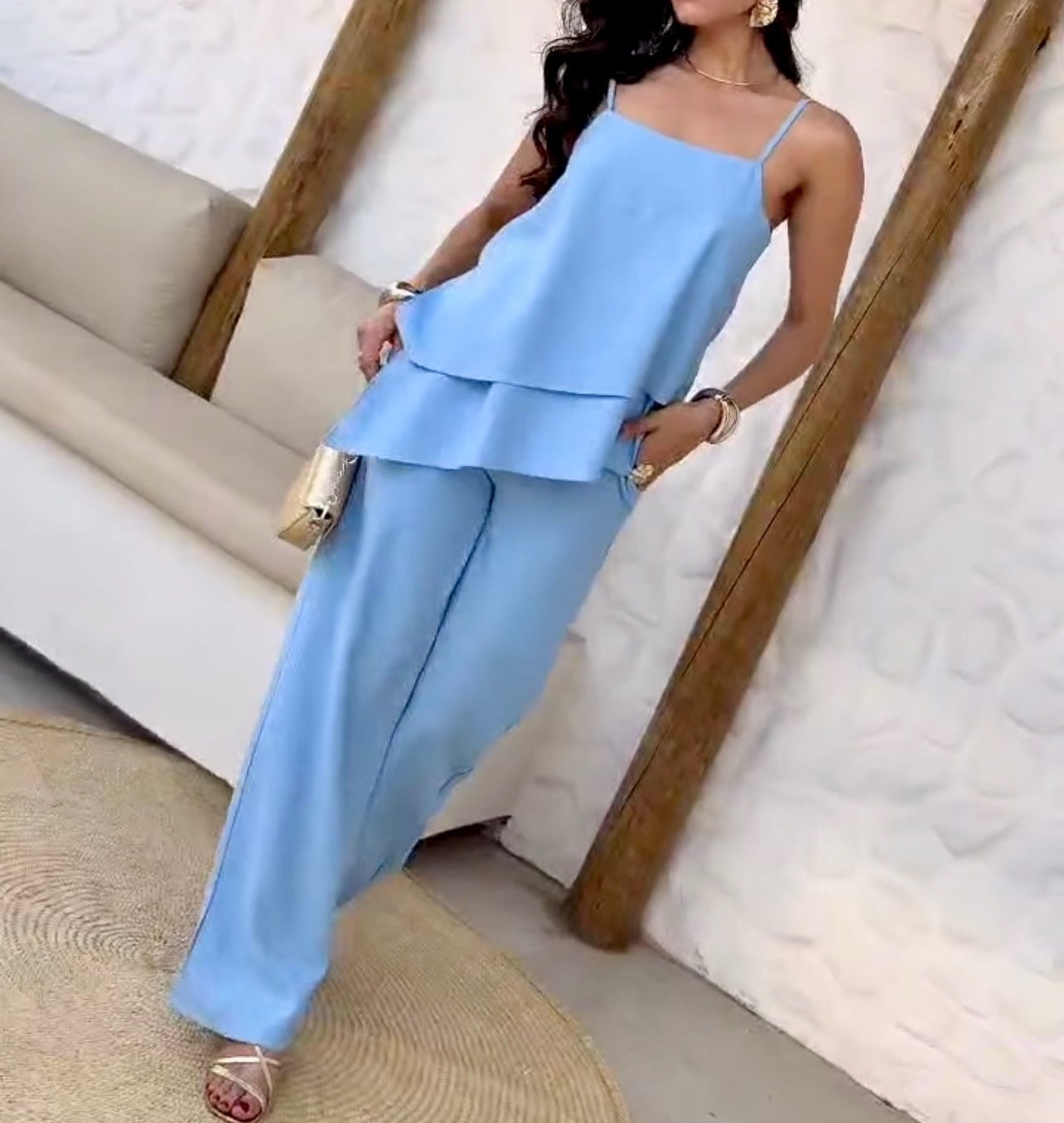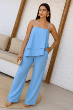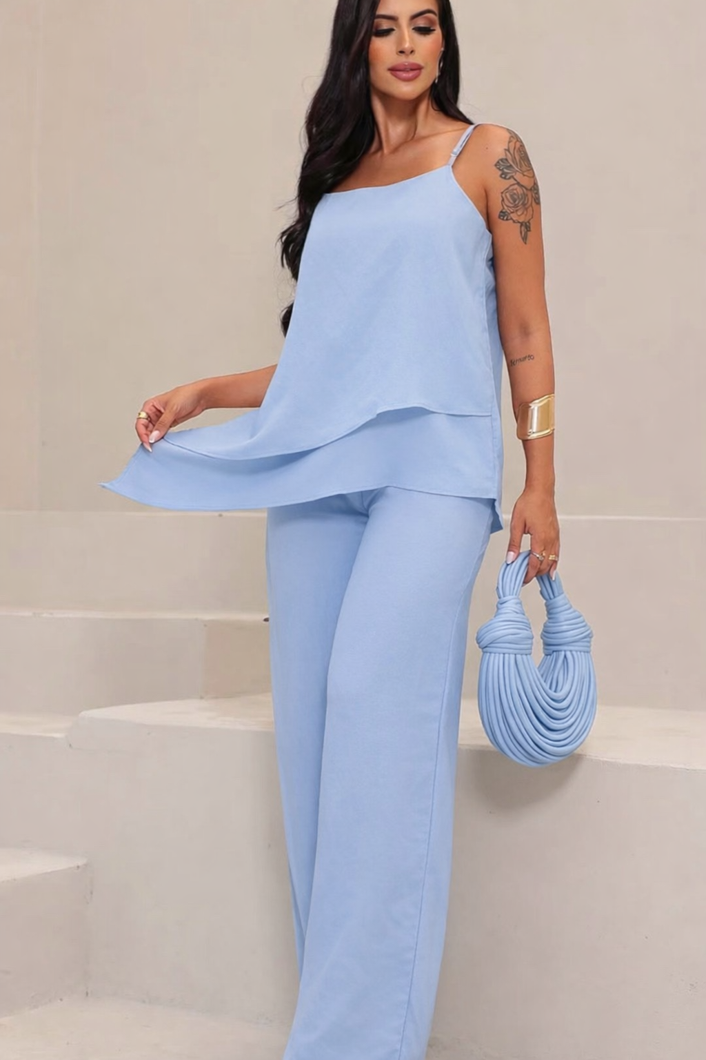 A blusa tem modelagem soltinha com alças finas e sobreposição delicada, enquanto a calça pantalona garante um visual alongado e