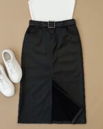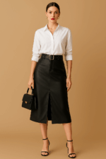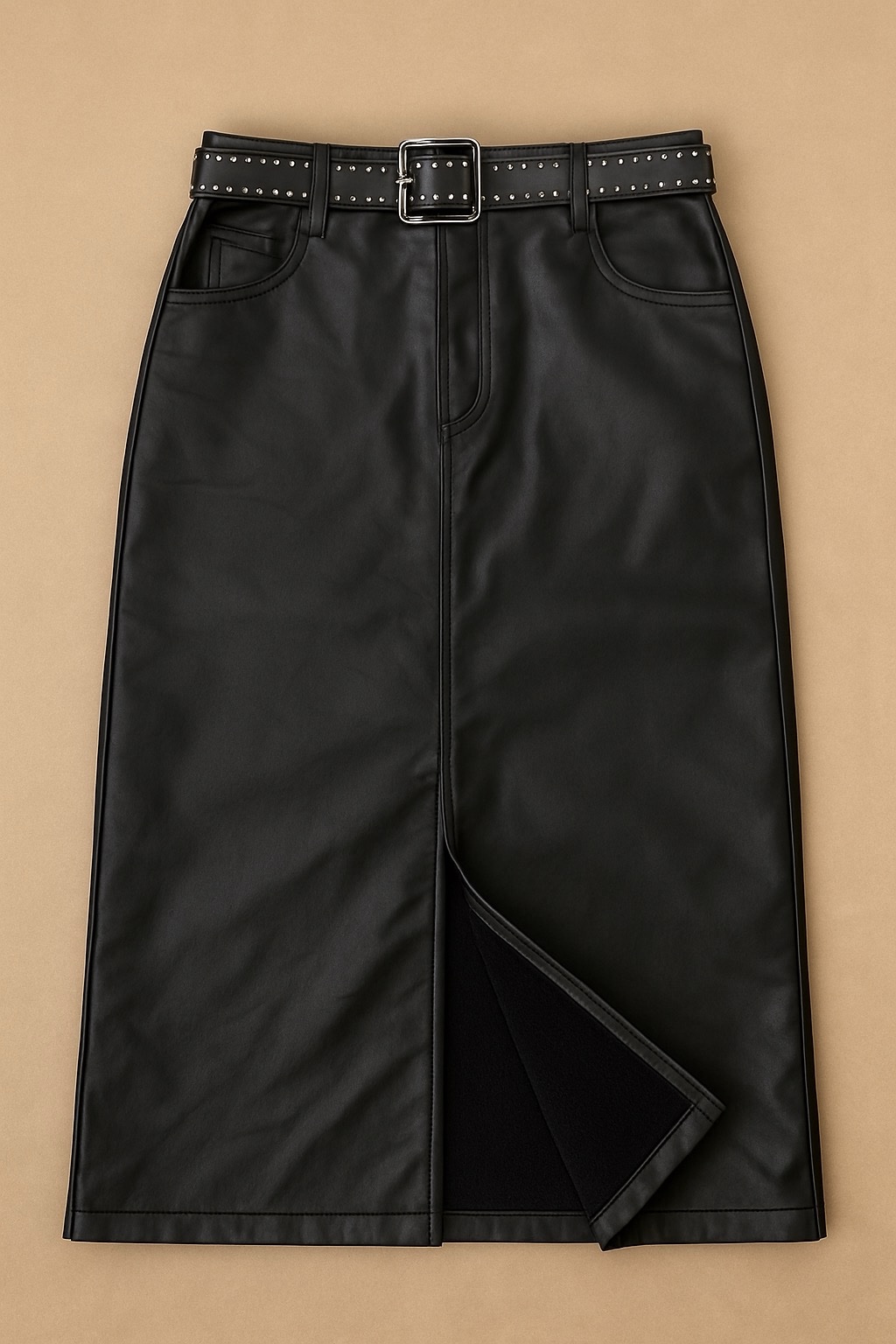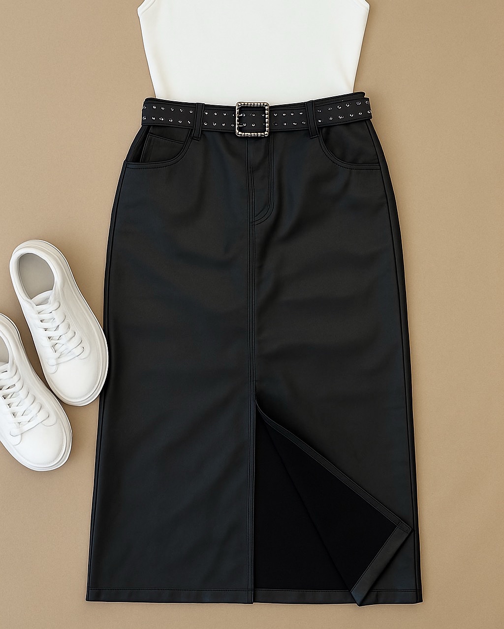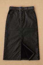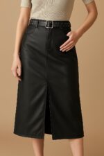 Descrição: Saia midi em material sintético com acabamento estilo couro, perfeita para compor looks modernos e estilosos. A peça possui modelagem reta, fenda frontal que valoriza o visual e proporciona conforto ao caminhar, além de ser felpada por dentro — ideal para dias mais fresquinhos. Acompanha cinto com fivela quadrada e aplicação de tachas, que adiciona um toque de atitude à produção. Conta também com bolsos funcionais e fechamento por zíper e botão. Versátil e atemporal, combina tanto com tênis quanto com botas ou salto.